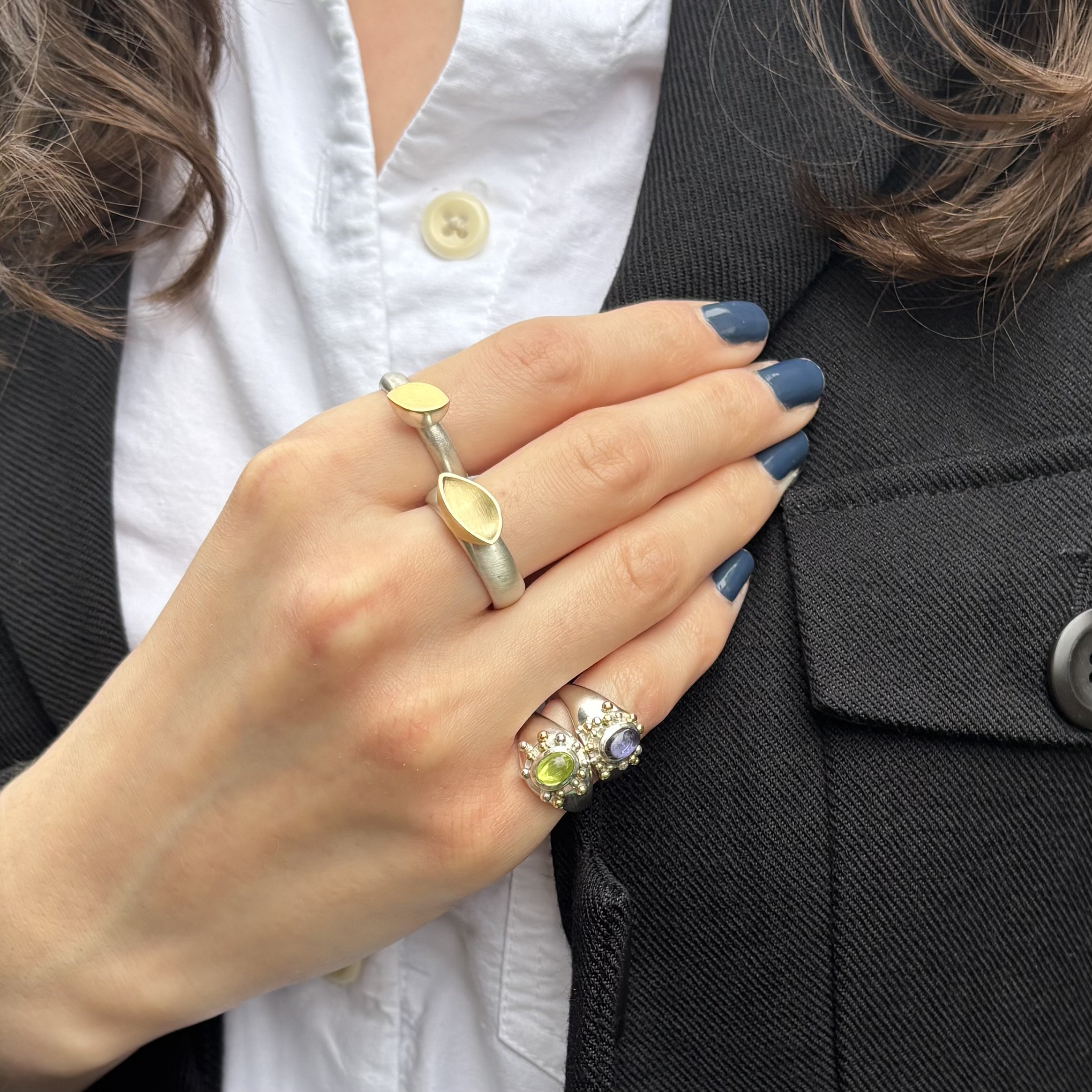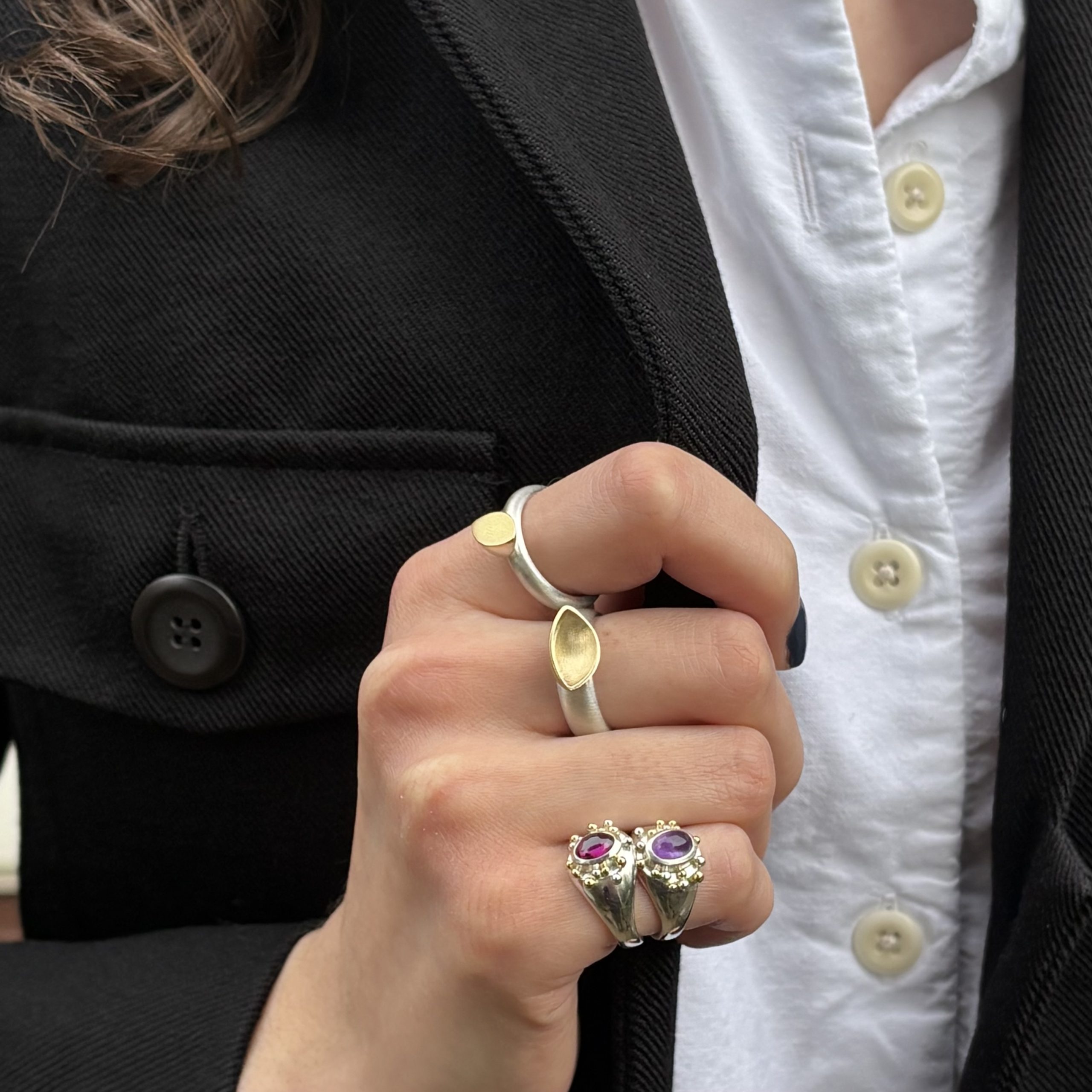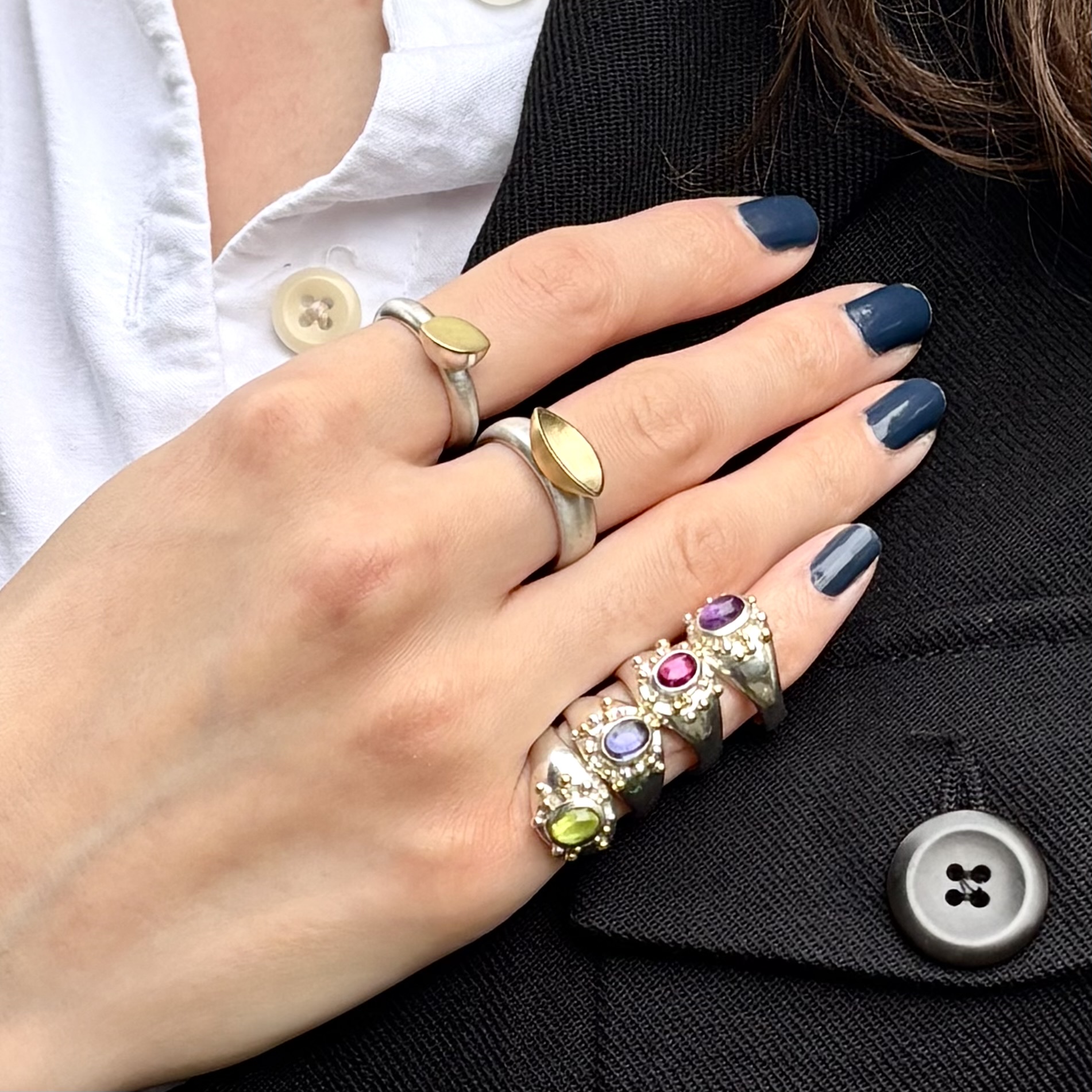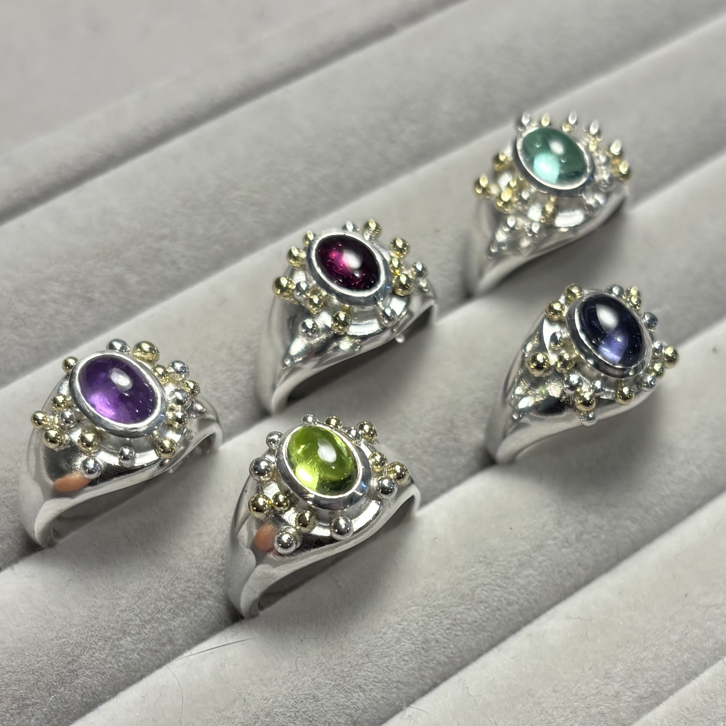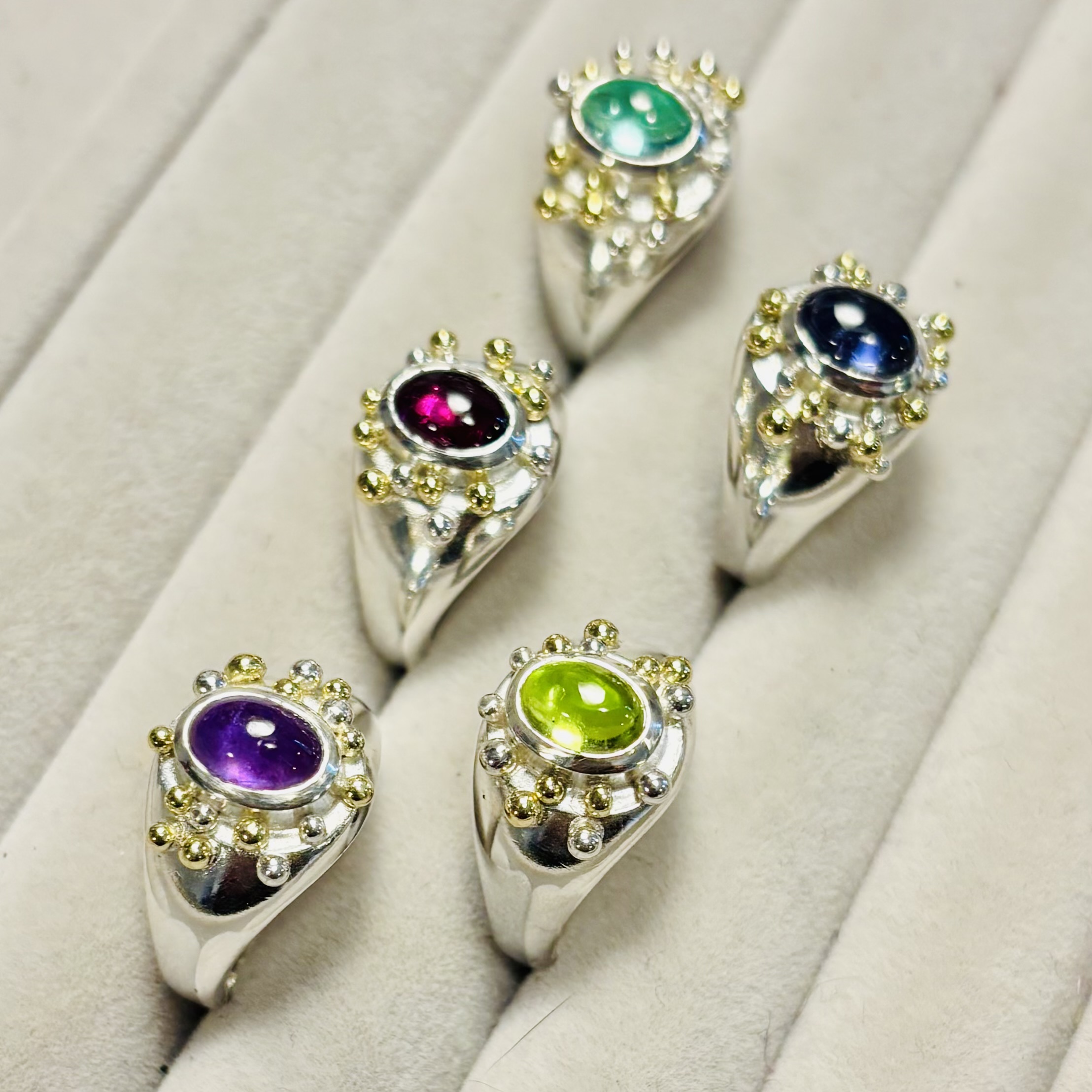 -Rings in sterling silver with 18ct gold details. Available in a variety of gemstones or to commission with your birthstone.
